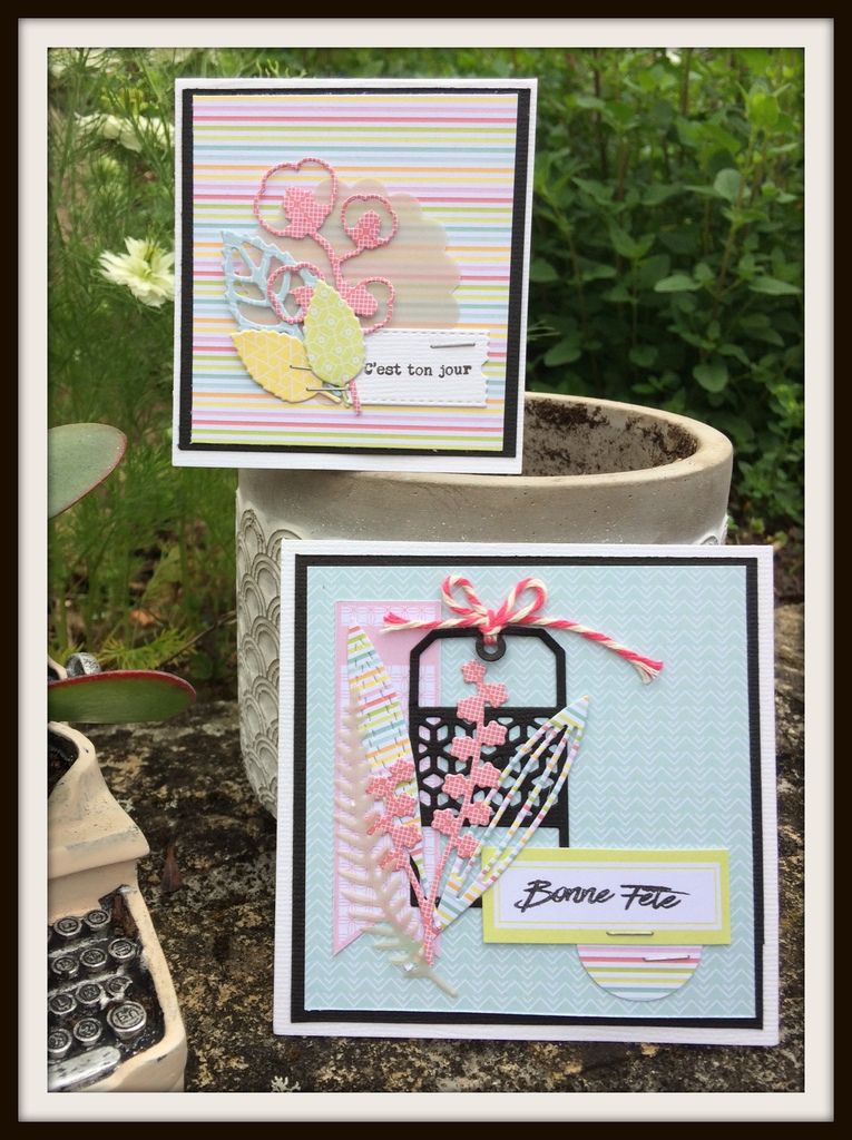 Voici donc ma petite série de cartes réalisées avec les papiers colorés de la collection Un Air Printanier (Fée du Scrap).