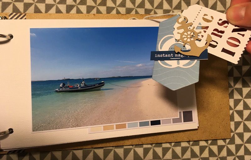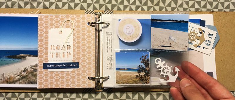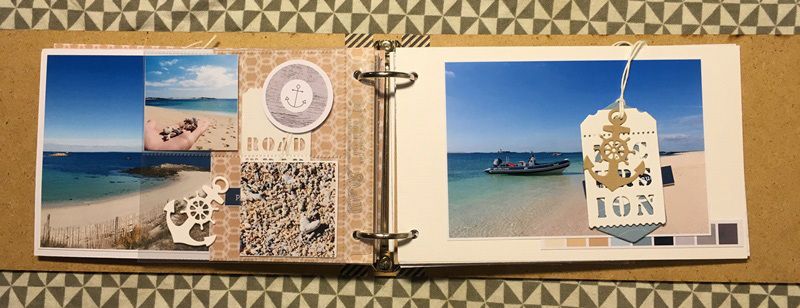 Côté papier, je suis partie sur la collection Un Air Marin. J'ai ajouté du bazzill blanc et kraft, une planche d'étiquette bleu et quelques découpes et le tour est joué.
