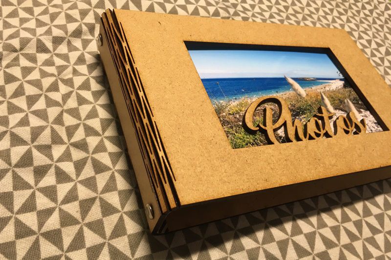 J'ai utilisé la structure d'album en bois pliable "Photos". Une structure à manier avec précaution mais qui donne tout de suite un superbe rendu. Les tons de l'album étant bleu - blanc - kraft, je l'ai volontairement laissé brut mais il peut bien entendu être recouvert de peinture.