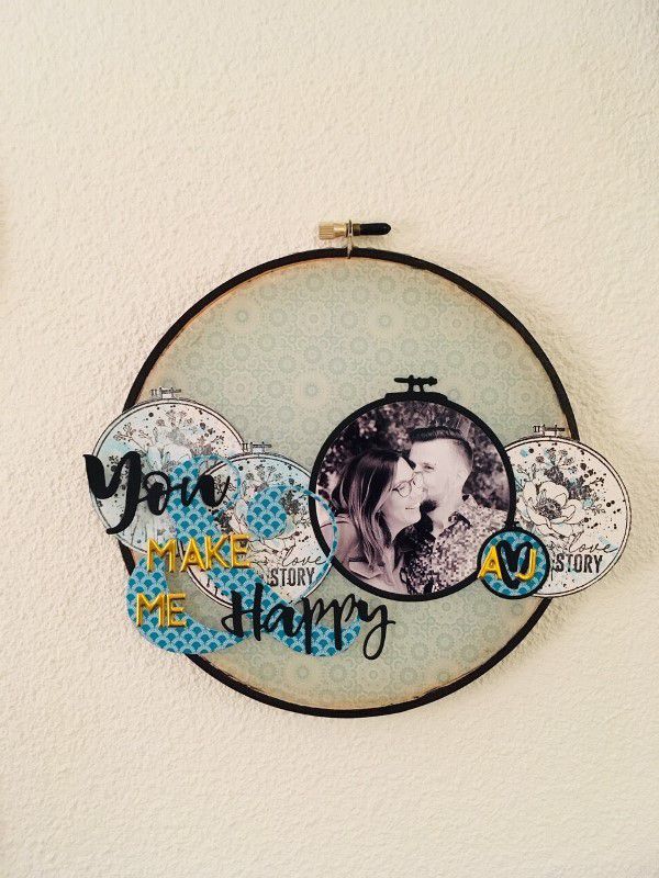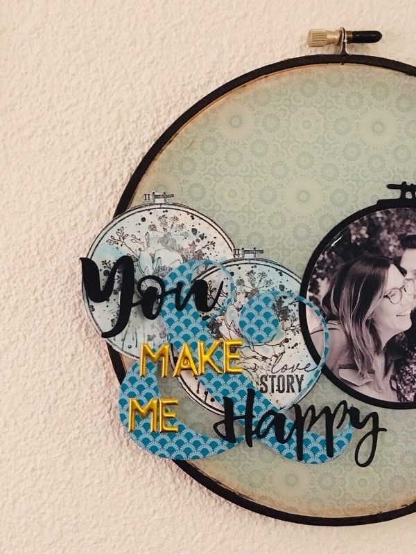 En plus de la structure, j'ai continué dans le thème "cercle à broder" avec des dies et surtout le tampon bois "Notre love story" de chez Florilèges design.